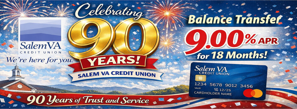 Salem VA Credit Union is your community credit union providing a full range of services to help you achieve your current and future financial goals. If you live, work, or worship in Roanoke City, Roanoke County, the city of Salem or the town of Vinton you are eligible to join Salem VA Credit Union. Salem VA Credit Union lives the “we’re here for you” philosophy every day, and we look forward to building a long-term relationship with you, and your family!